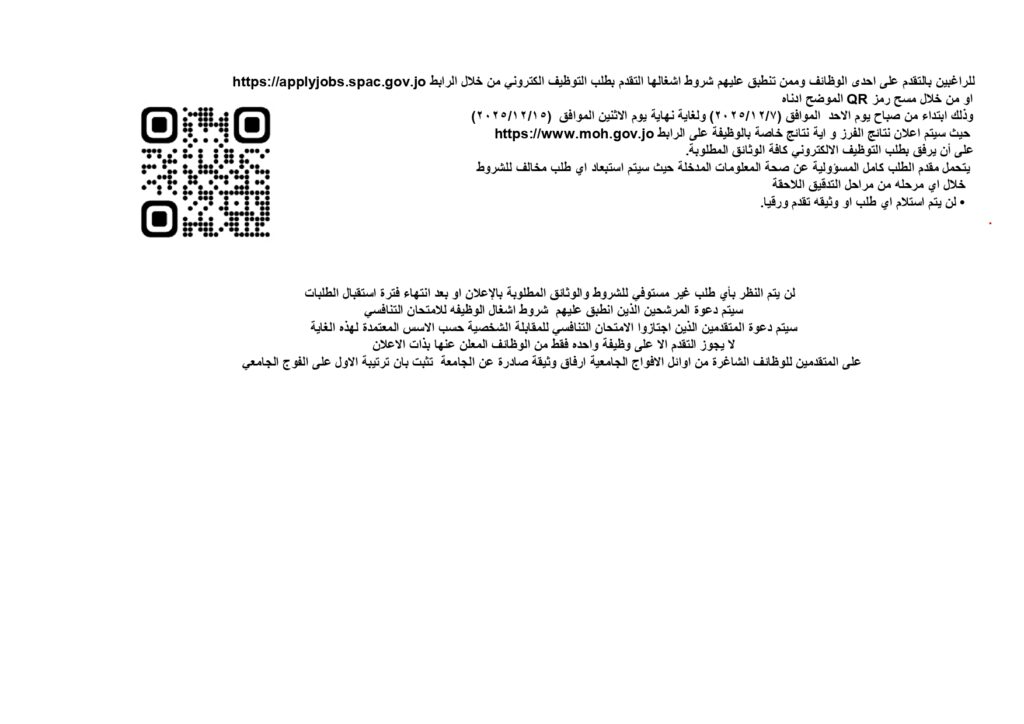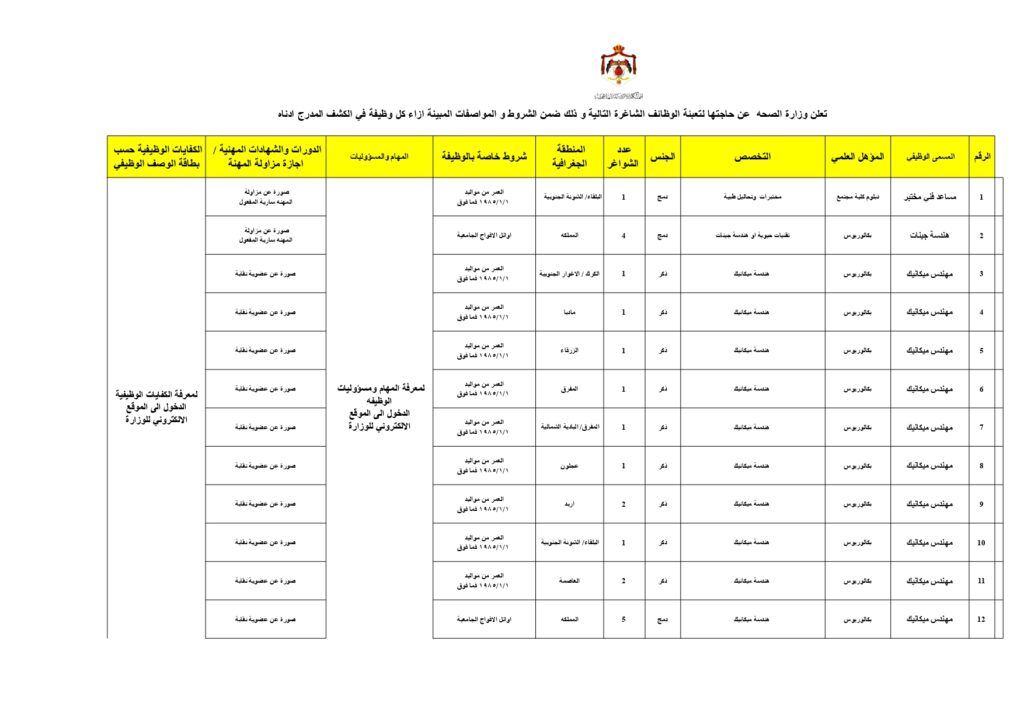 أعلنت وزارة الصحة الأردنية عن فتح باب التقديم لتعبئة مجموعة كبيرة من الوظائف الشاغرة في مختلف التخصصات الطبية، الهندسية، والفنية، وذلك وفق الشروط والمواصفات المبينة في جداول الإعلان الرسمي.