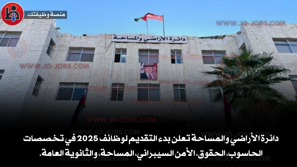 أعلنت دائرة الأراضي والمساحة عن بدء استقبال طلبات التوظيف لعدد من التخصصات المختلفة للعام 2025، وذلك اعتبارًا من يوم الأحد 7/12/2025 وحتى الاثنين 15/12/2025.