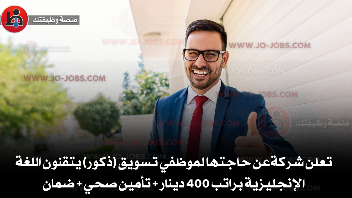 تعلن شركةعن حاجتها لموظفي تسويق (ذكور) يتقنون اللغة الإنجليزية براتب 400 دينار + تأمين صحي + ضمان