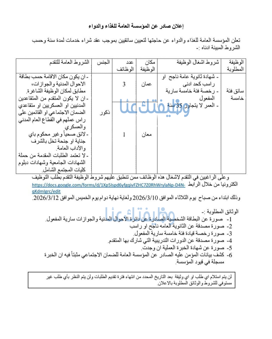 أعلنت المؤسسة عن حاجتها الماسة لتعيين عدد من السائقين بموجب عقود (شراء خدمات) لرفد فروعها في العاصمة عمان ومحافظة معان. تُعد هذه الفرص من أبرز وظائف اليوم للشباب الأردني الباحث عن عمل مباشر. نظراً لقصر فترة التقديم، ندعوك لقراءة هذا الدليل الشامل فوراً لتجهيز أوراقك، والالتحاق بأهم وظائف الأردن 2026.